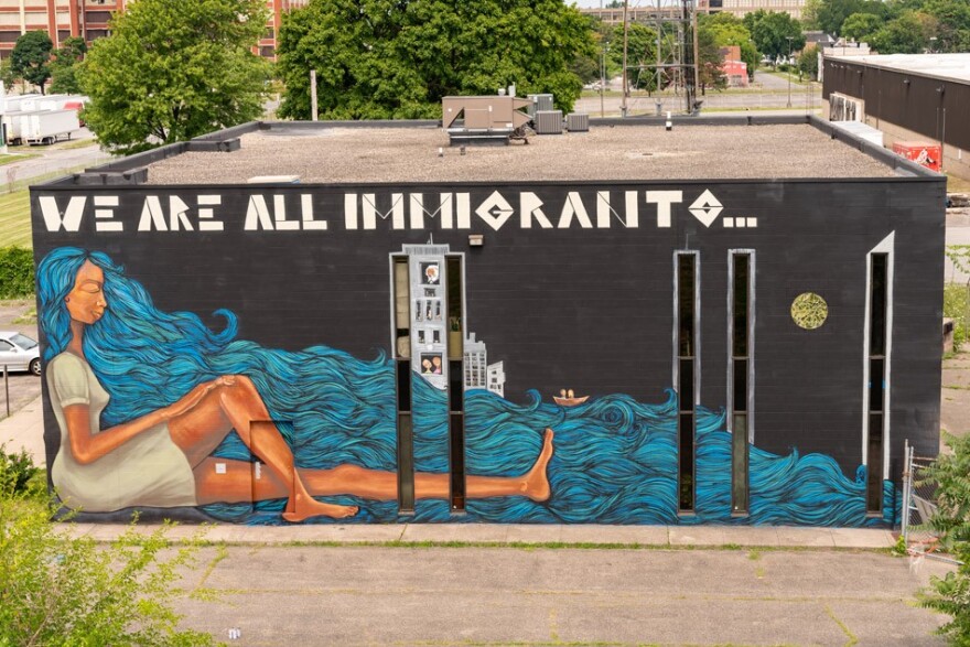 Salut's mural on East Main Street. New York City-based W\T alum Alice Mizrachi's wall, at Rochester Community TV (21 Gorham Street), features a woman whose flowing tresses become the sea upon which a couple of people float in a boat. The small craft weaves among skyscrapers that Mizrachi painted around the buildings tall, narrow windows. Along the top of the wall painted letters read: "We are all immigrants," a personal message about her own parents' immigration to the United States, Lehman says.