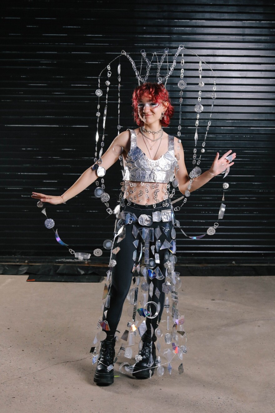 “I am wearing a sculpture that I made from all recycled materials — things I found in the trash and cut up. Cups, CDs, tinfoil – I spent a long, long time on it. Our prompt for this project was ‘memory,’ so I’m obscuring the line between dream and reality, which is ever-changing, just like your mind and memory.”