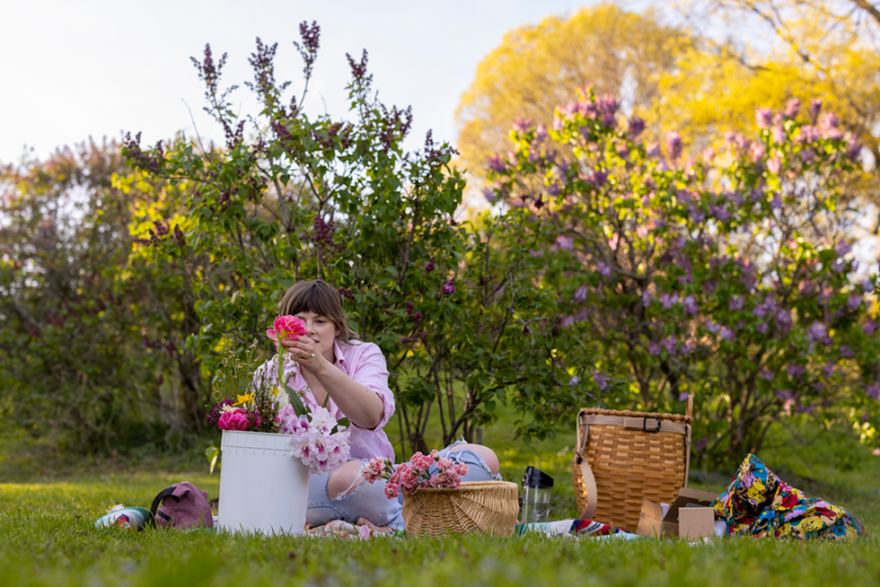 Madeline Hubert, a florist, arranges flowers for a photo shoot at Highland Park.