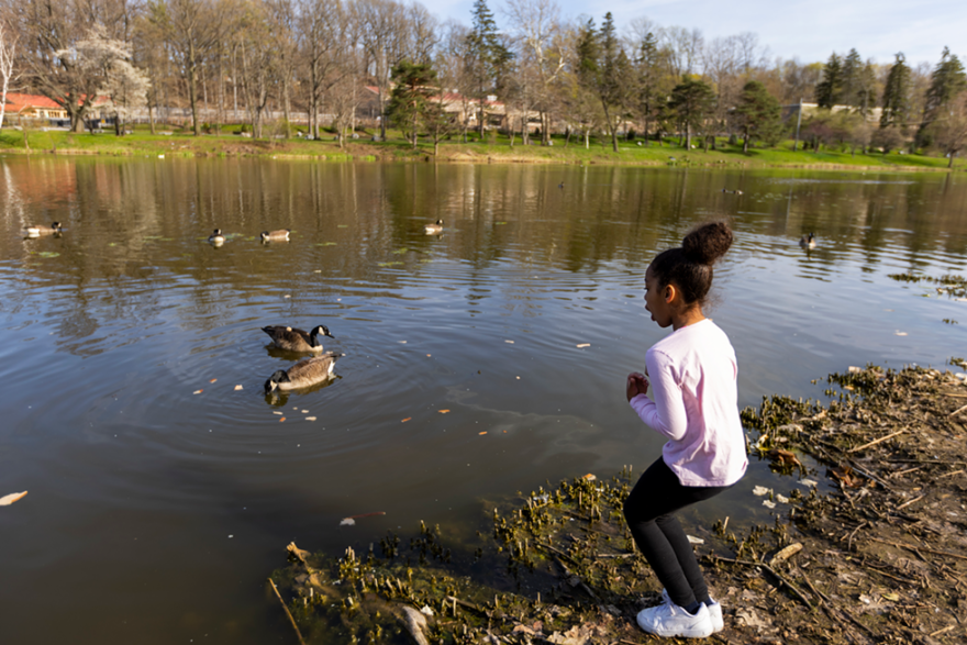 Heaven, 6, of Irondequoit, quacks like a duck as she feeds the geese at Seneca Park.