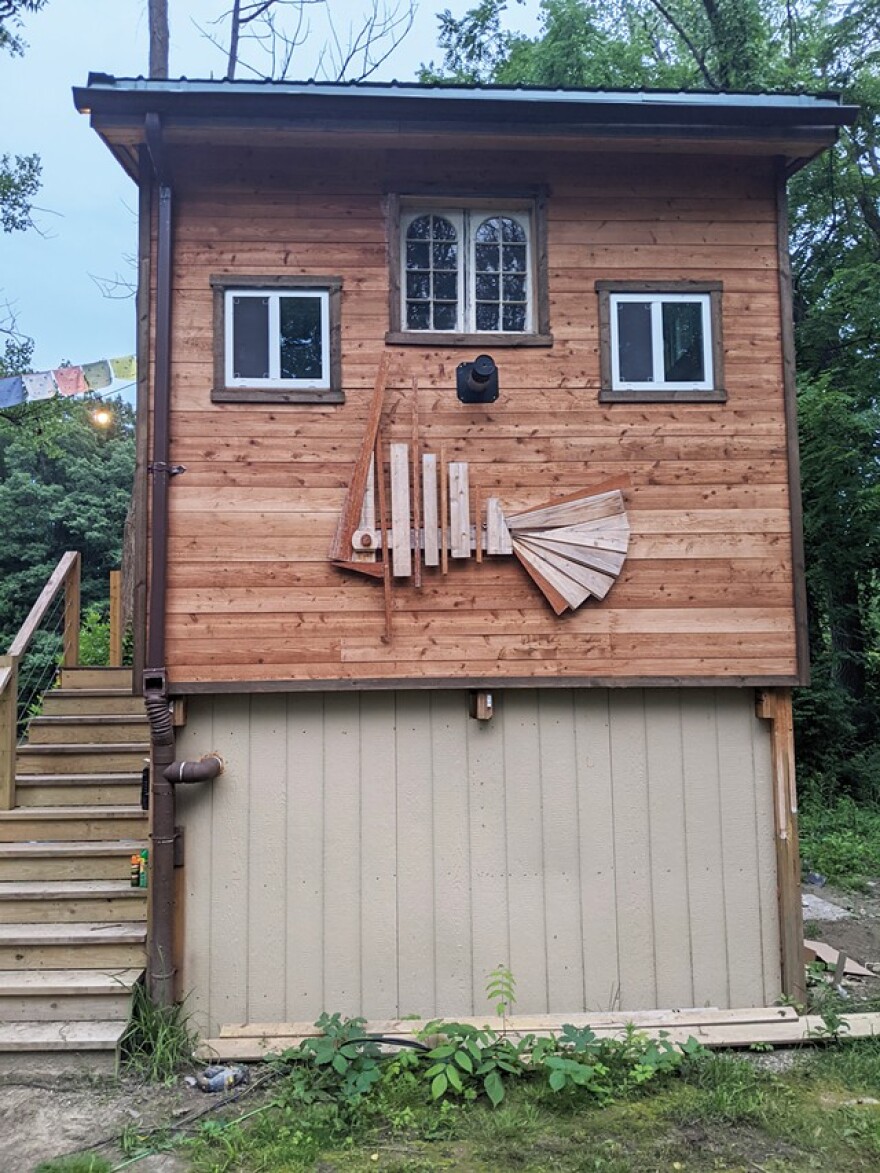 The composting toilet on site was only just added. Before that, visitors for whom nature called simply made like a bear in the woods. Twenty-four solar panels power a large battery system underneath the tiny house, but the set up suffered a setback recently when a lightning strike damaged the wiring.